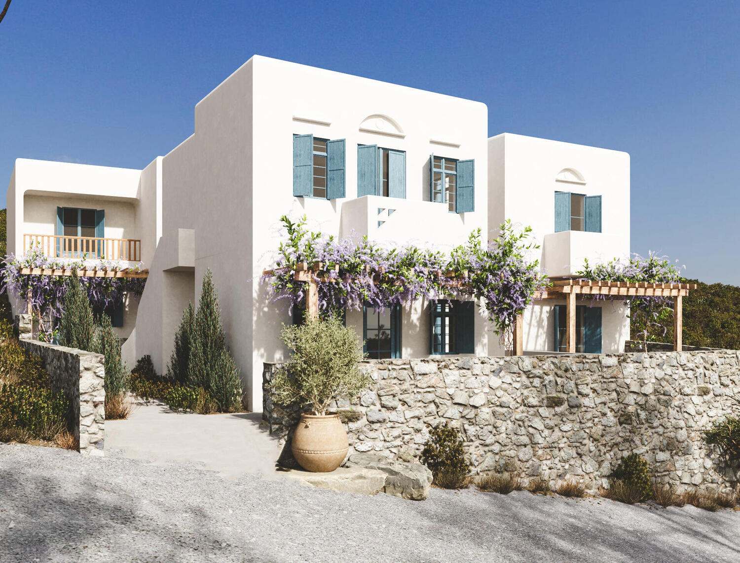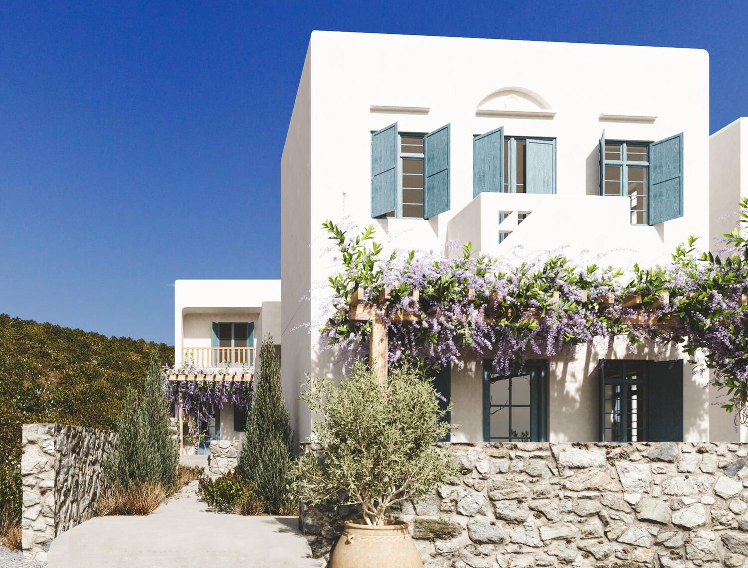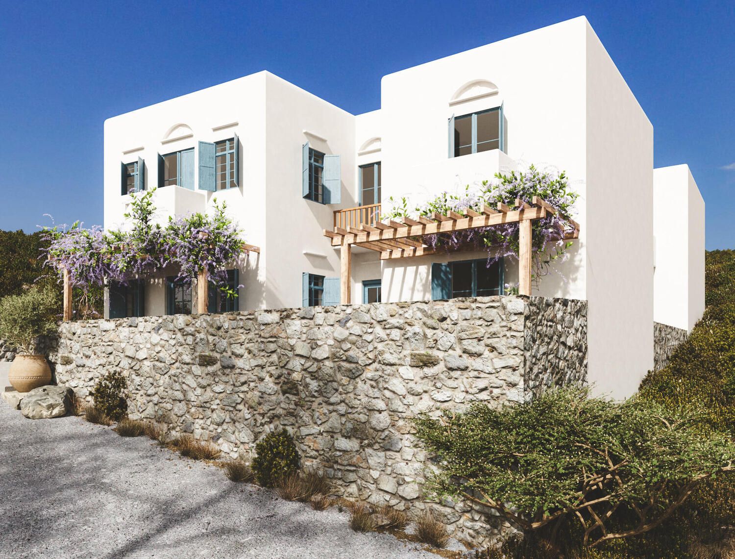 Δημιουργία σειράς εξωτερικών φωτορεαλιστικών για κτήριο ενοικιαζόμενων δωματίων στην Μύκονο.