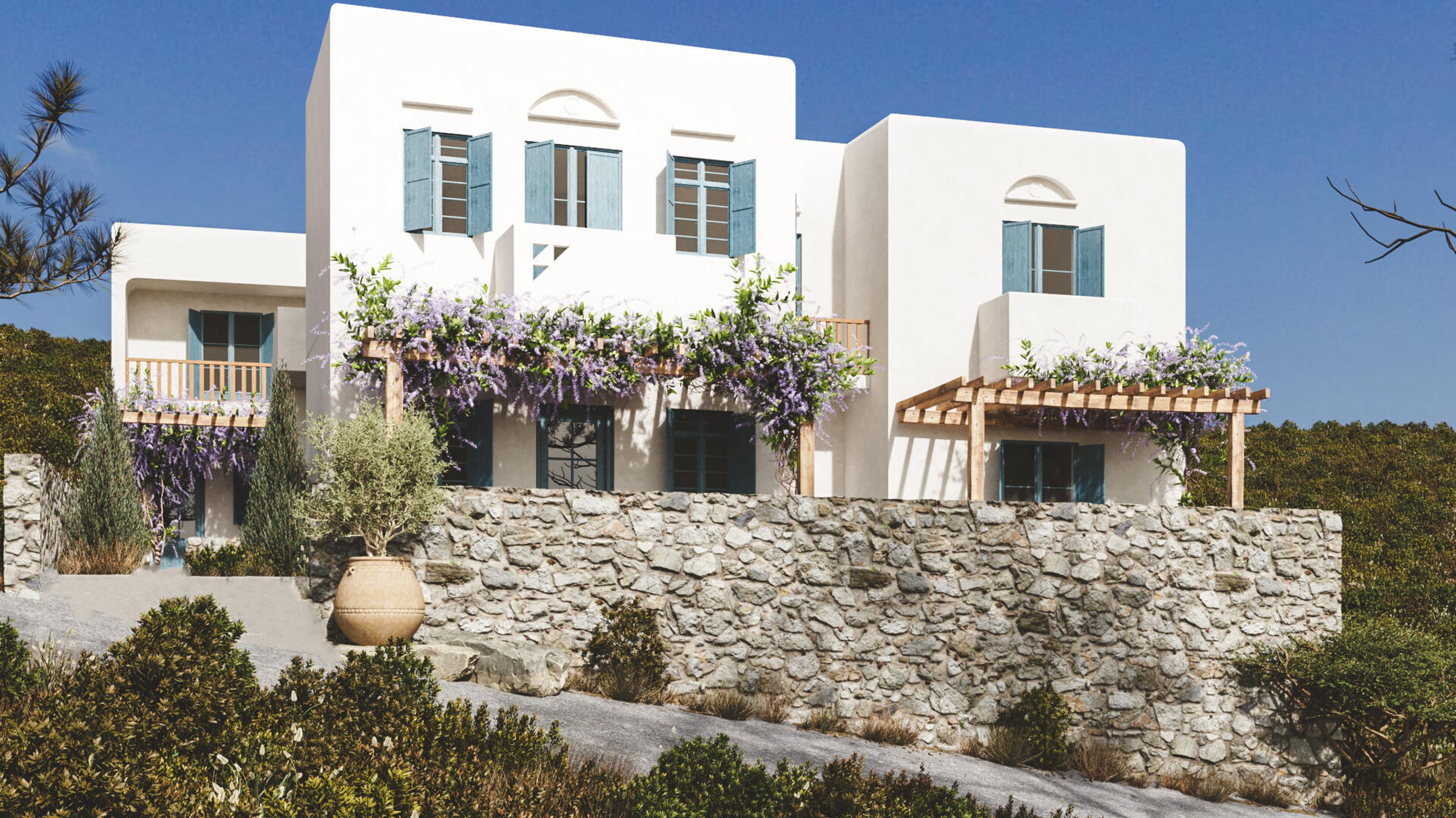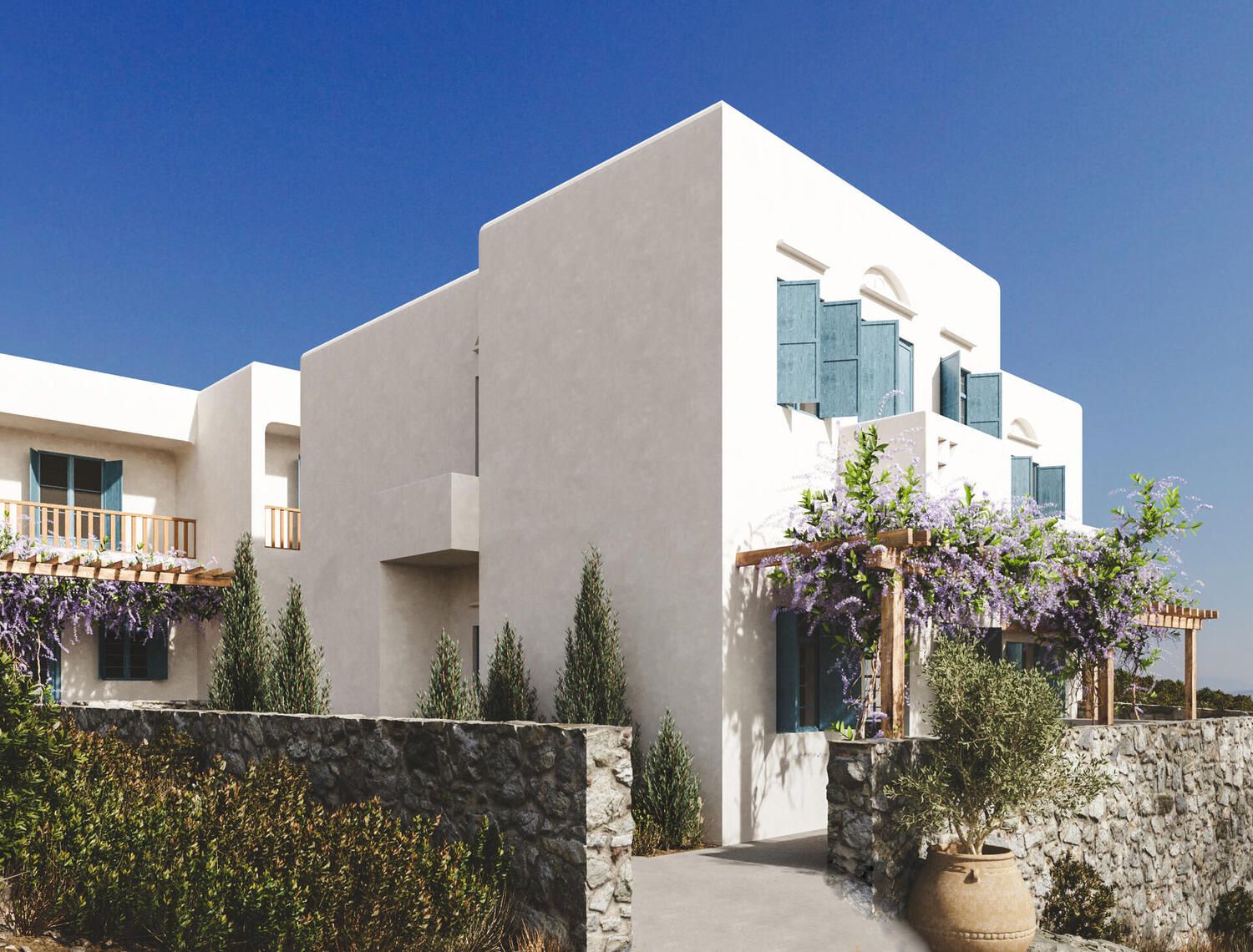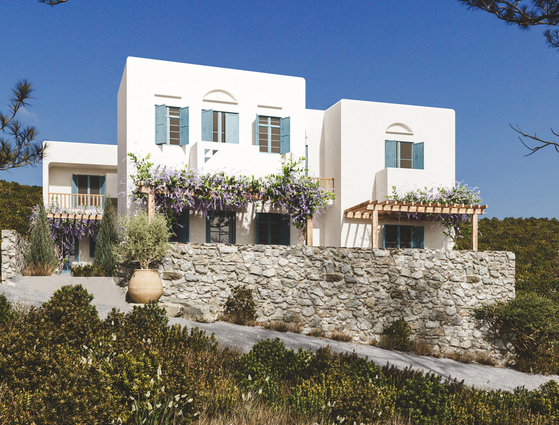 Δημιουργία σειράς εξωτερικών φωτορεαλιστικών για κτήριο ενοικιαζόμενων δωματίων στην Μύκονο.